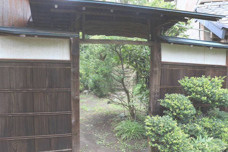 The garden gate has a frontage of 1.16m and is in the form of an arm gate. The main pole of the polished log is used to directly support the purlin, and the arms are put forward and backward from the pillar to place a log girder. The rafters are polished logs and have a gentle gabled, copper-plated roof. At present, there is no gate, but it can be guessed that two doors were originally open from the metal fittings remaining on the main pillar. There is a fence of wooden fences between the grossed open door and the purlin, and similar materials are used in the room on the west row of the main building.