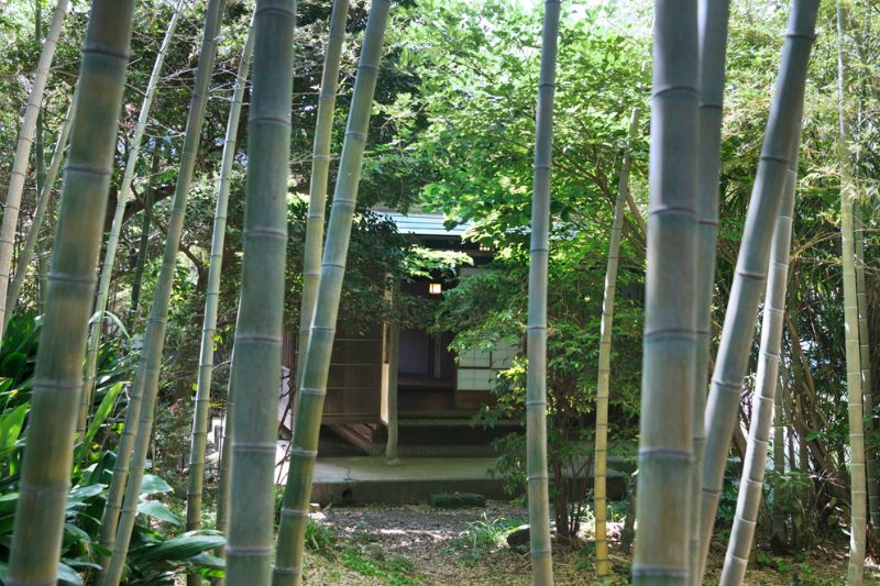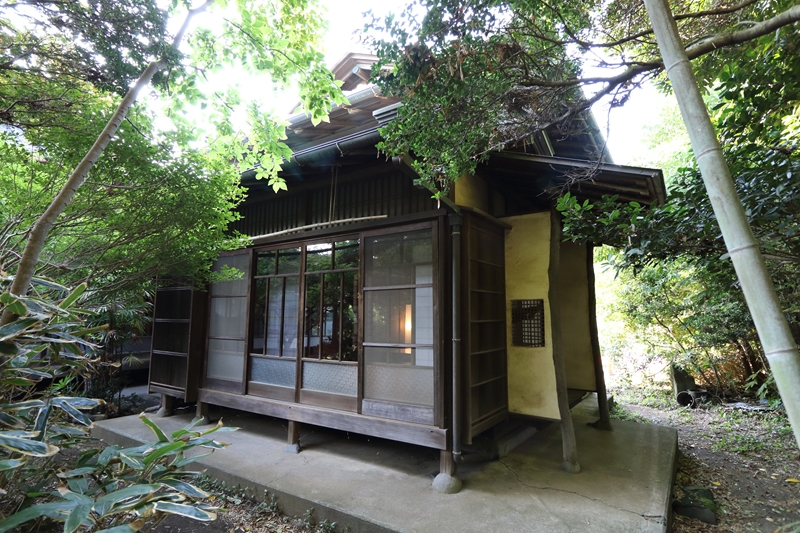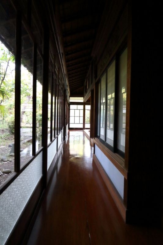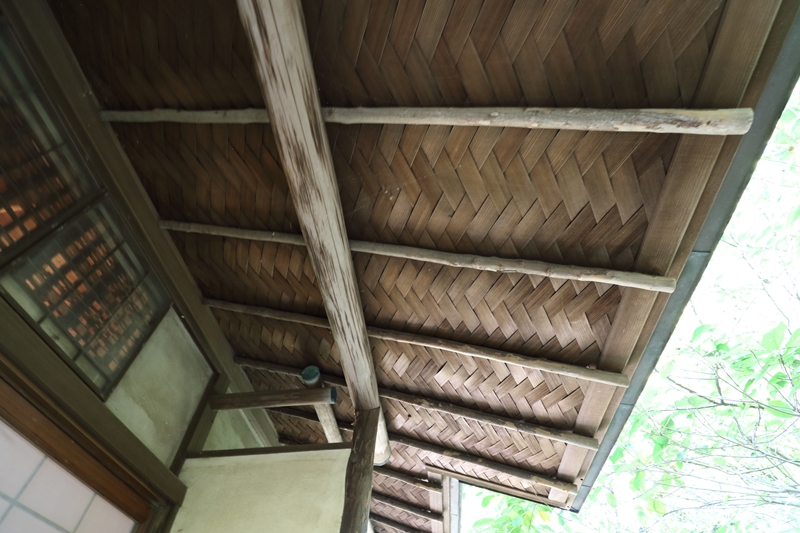 On the other hand, the east side is separated from the main room (eight tatami mats) and the front room (six and a half mats). There is a trace of a “Mizuya” in the front room, and the entrance with a wet edge is set east of the main room, so it seems that it was assumed to be used as a tea room, but it has now been changed from tatami flooring to wooden flooring. Unlike the main part, it is a Sukiya-style design, with a log pillar pressed on the skin column, a bag floor using soot bamboo between the floors, the floor pillar is a log with a spicy skin, the diving diving is a soot bamboo Igaki group, the ceiling beside the floor is a wabi etc. It has a taste. The rim of the ceiling is also skin, and the ceiling board of Yaku cedar is used as the floor covering. The Fujiko pattern on the floor is also beautiful. According to the note on the copy of the ridge label mentioned earlier, at the time of the Great Kanto Earthquake, Yasugoro said, “After lunch, I was taking a break and reading the newspaper at the back tatami room'' and in the predecessor building, the back tatami room is located. The existing back tatami room may have been the retirement room of Yasugoro.
